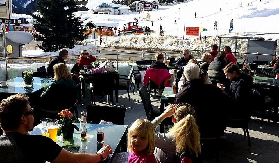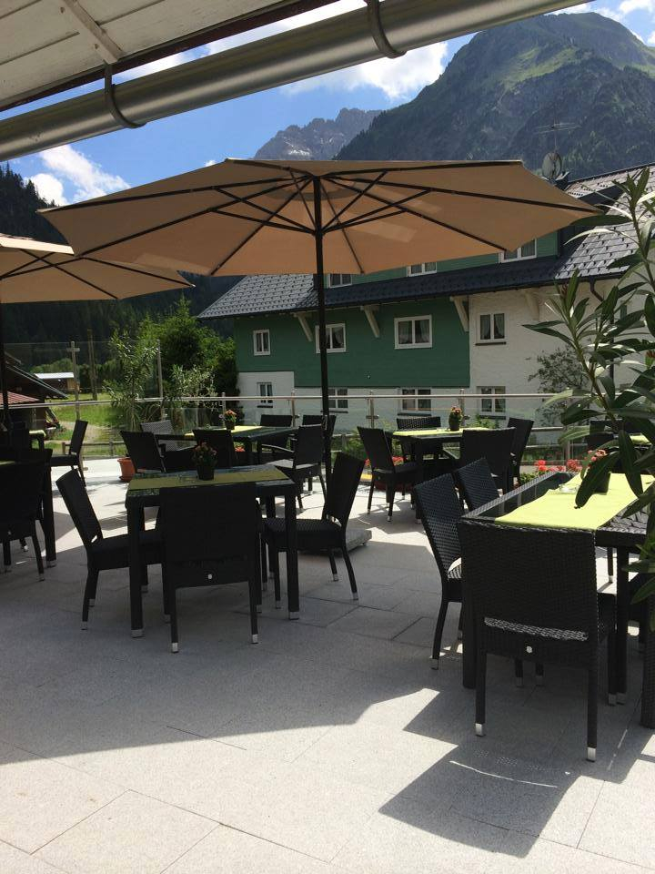 Auf der weitläufigen Sonnenterrasse genießt du nicht nur Allgäuer Spezialitäten, sondern auch den atemberaubenden Panoramablick auf die Walser Bergwelt.