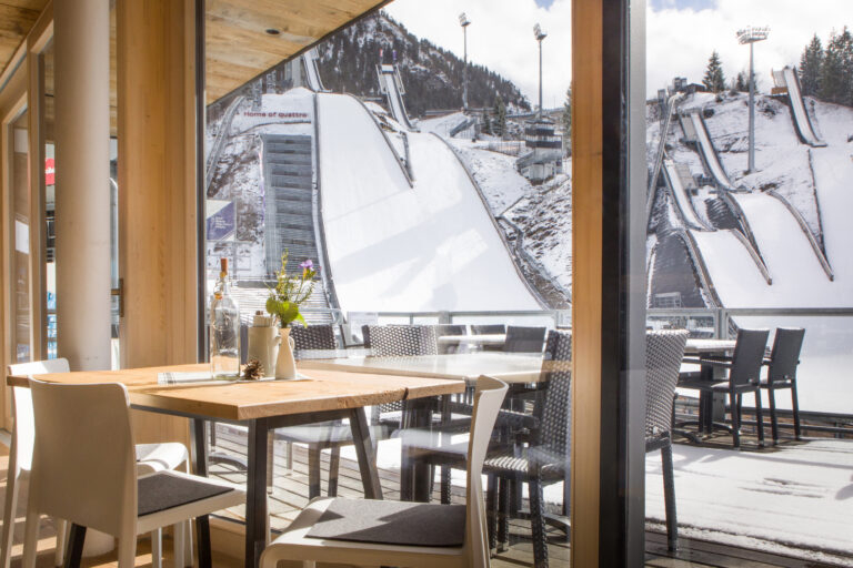 Einkehr mit Blick aufs Skisprungstadion im Herzen der ORLEN Arena Oberstdorf im Oberallgäu