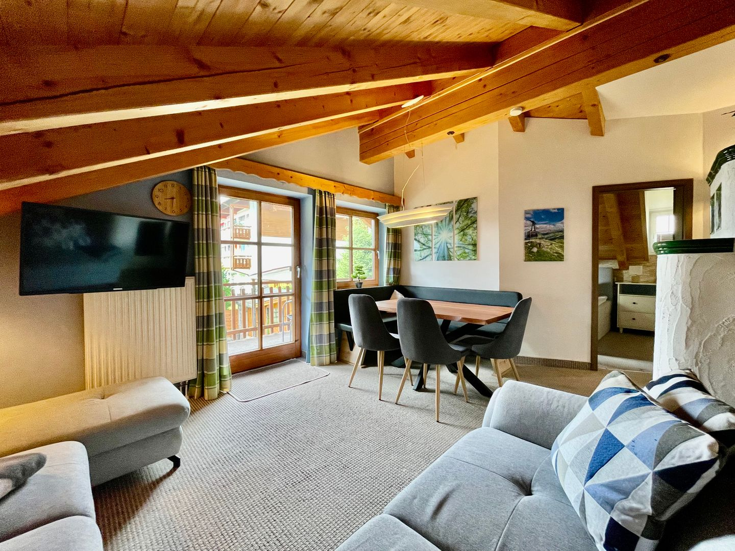 Liebevoll im Alpin-Stil mit Zirbenholzelementen eingerichtet, bietet sie drei große Balkone mit traumhaftem Blick auf den Alpenhauptkamm.