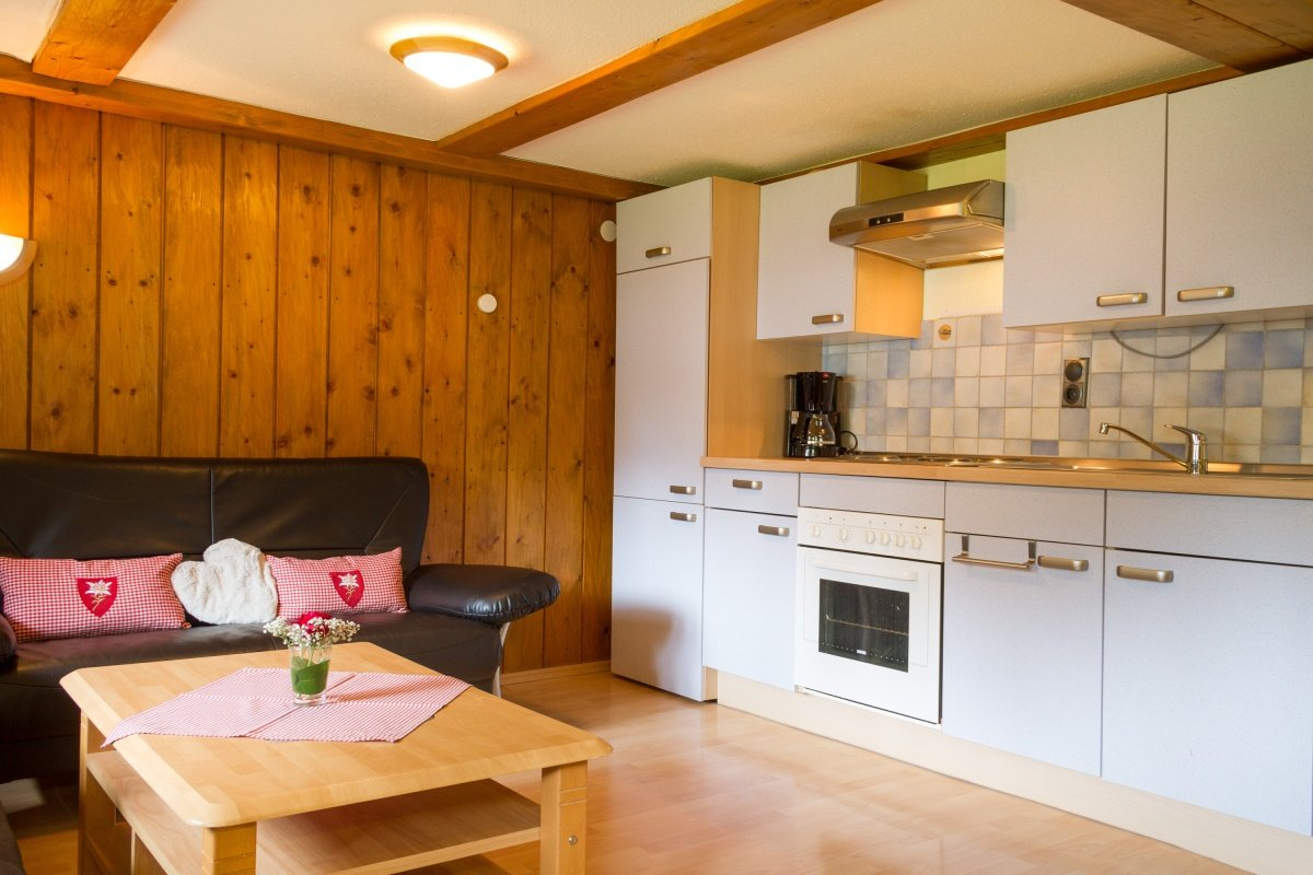 Nach einem aktiven Tag lädt die sonnige Südterrasse zum Entspannen ein – mit Blick ins Grüne und viel Ruhe zum Ausklang des Abends. Der helle Wohnraum mit gemütlicher Sitzecke bietet Dir einen angenehmen Rückzugsort, und in der voll ausgestatteten Küche findest Du alles, um Deine Lieblingsgerichte in entspannter Urlaubsatmosphäre selbst zuzubereiten.