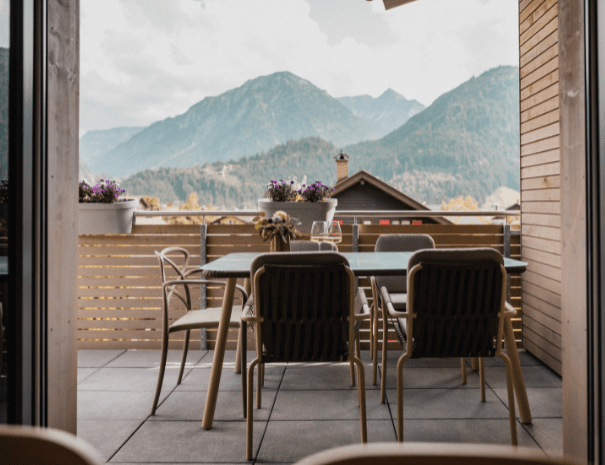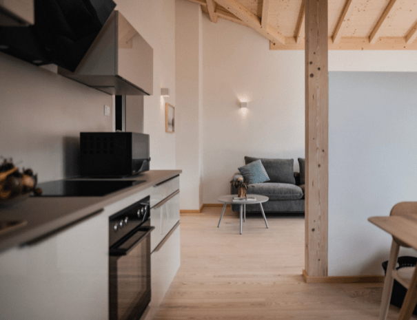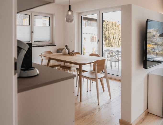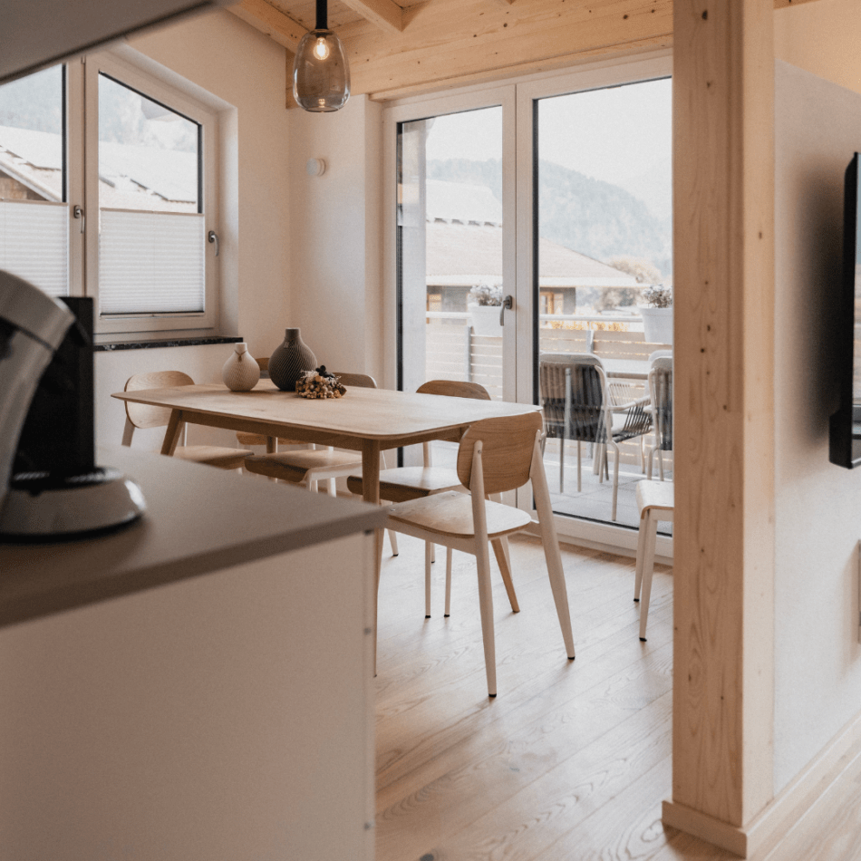 Zwei der Wohnungen verfügen über einen malerischen Südost- bzw. Südwestbalkon mit traumhaftem Bergblick, während die beiden Erdgeschoss-Appartements mit direktem Gartenzugang zu erholsamen Stunden im Freien einladen. Auf großzügigen 73 m² findest du alles, was du für einen entspannten Aufenthalt brauchst – von der voll ausgestatteten Küche bis zum gemütlichen Wohnbereich.