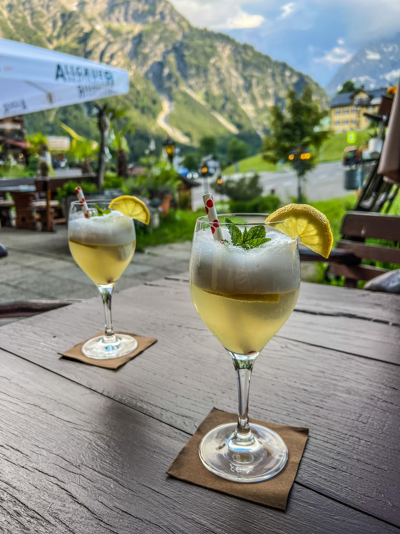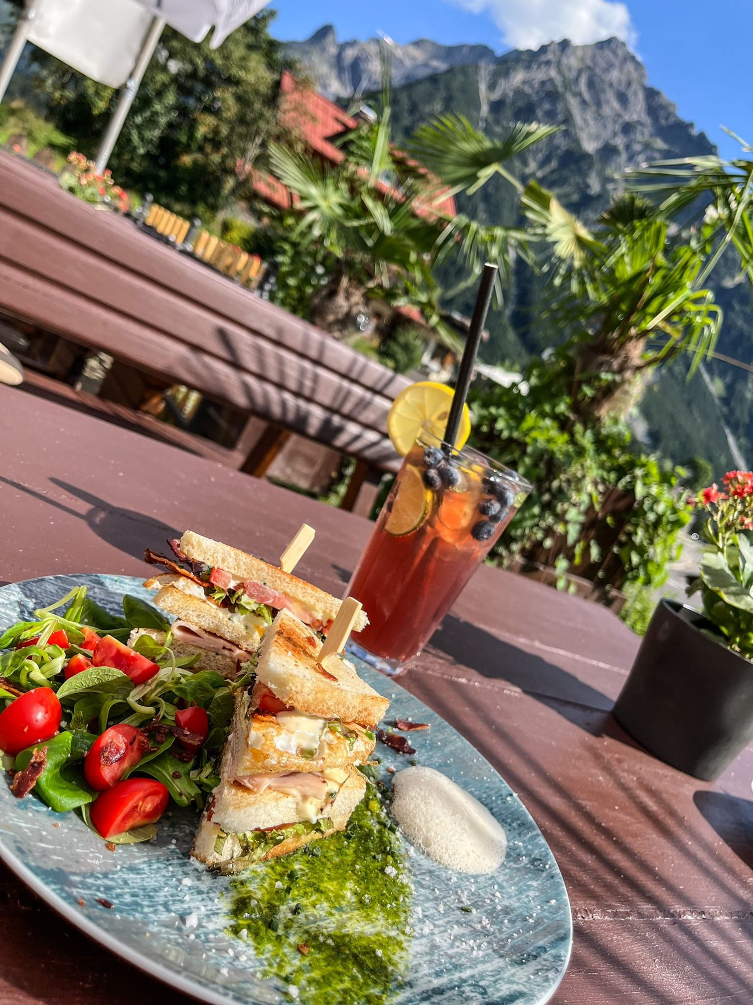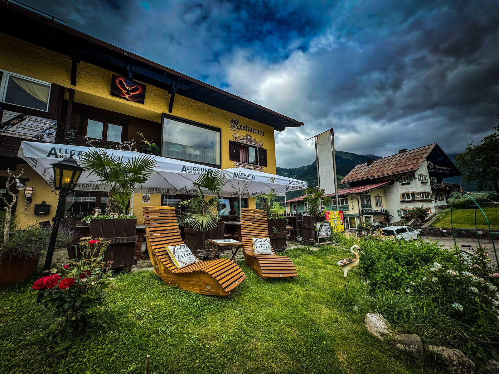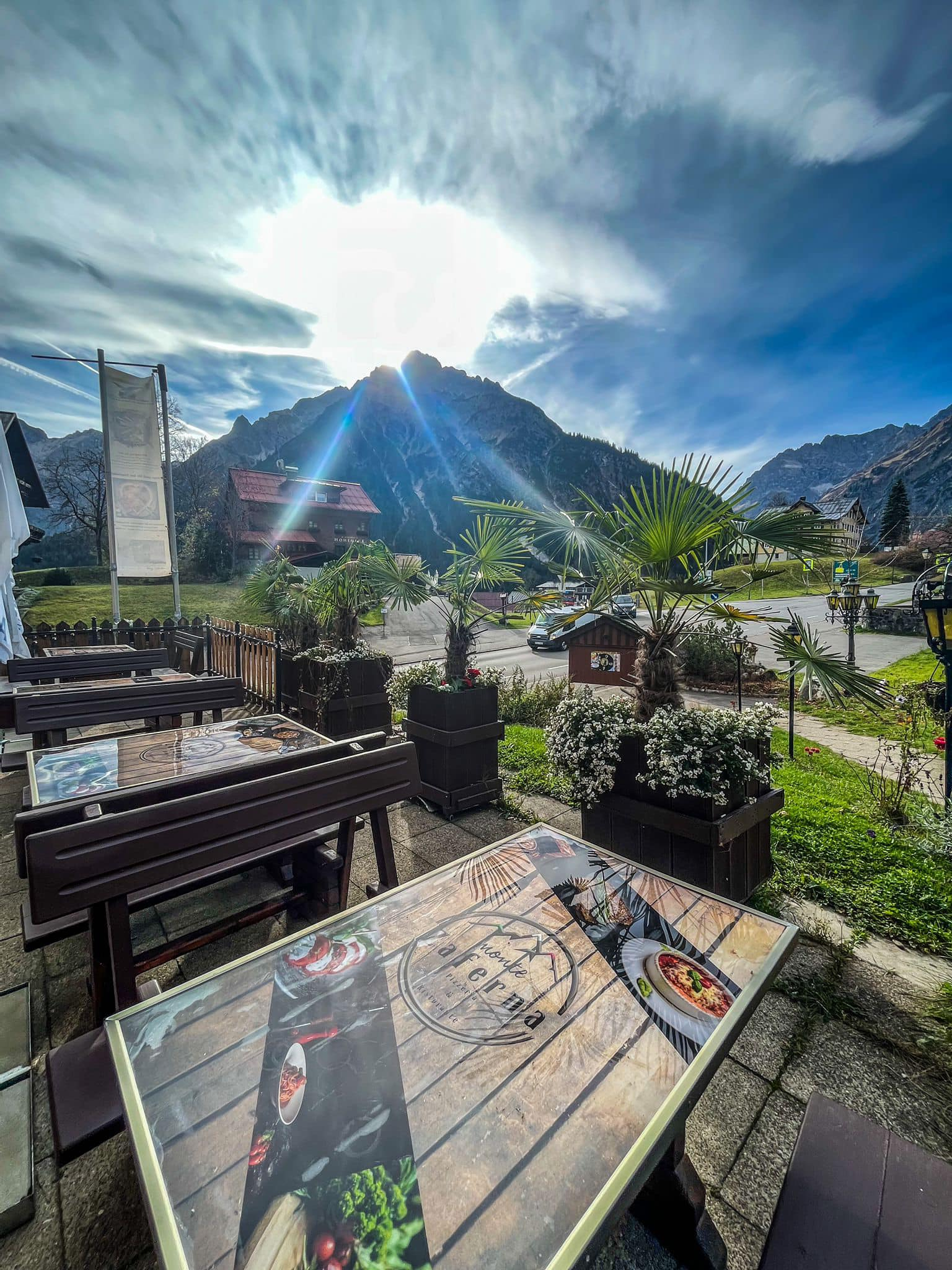 Auf der weitläufigen Sonnenterrasse genießt du nicht nur Allgäuer Spezialitäten, sondern auch den atemberaubenden Panoramablick auf die Walser Bergwelt.