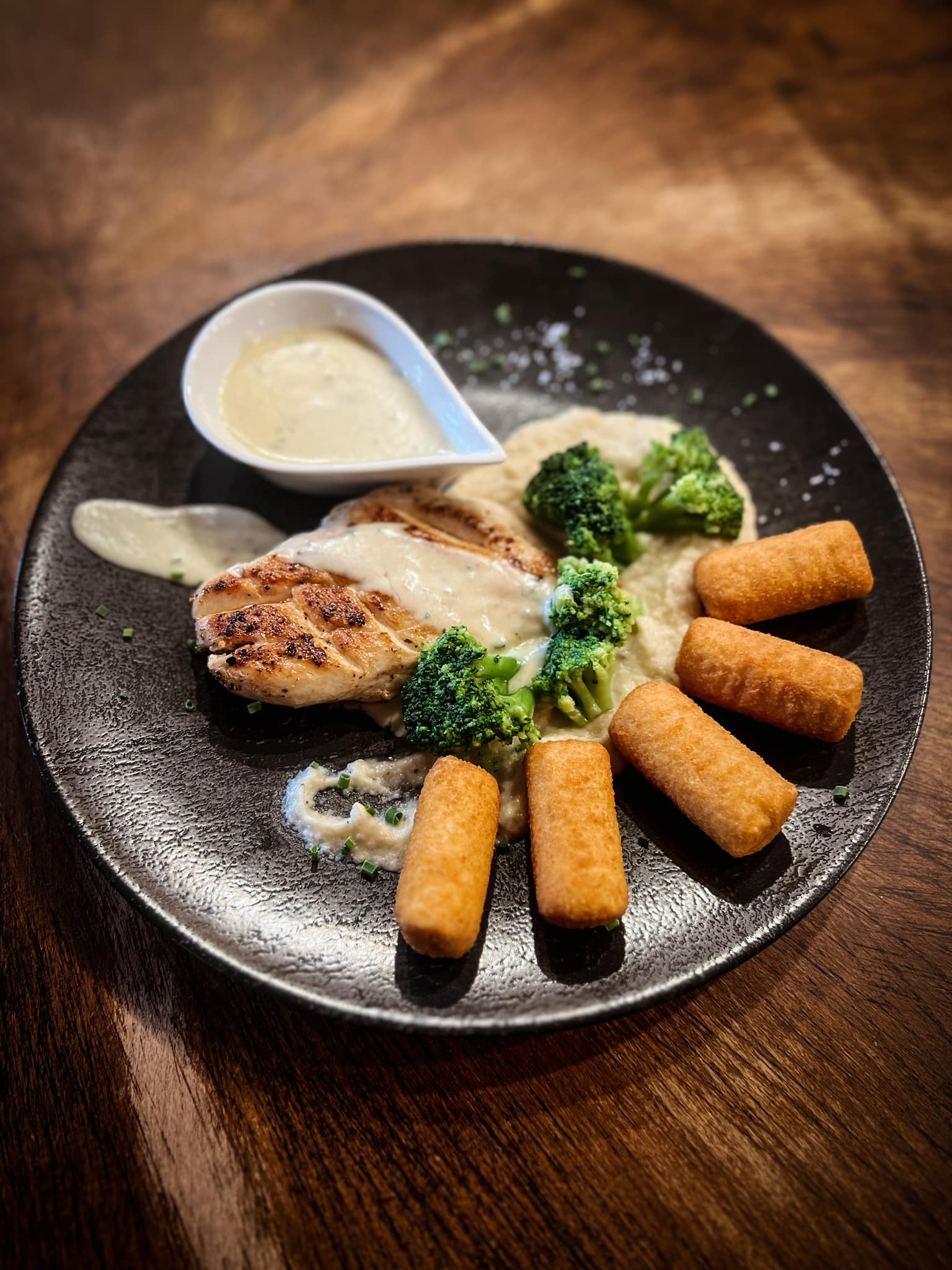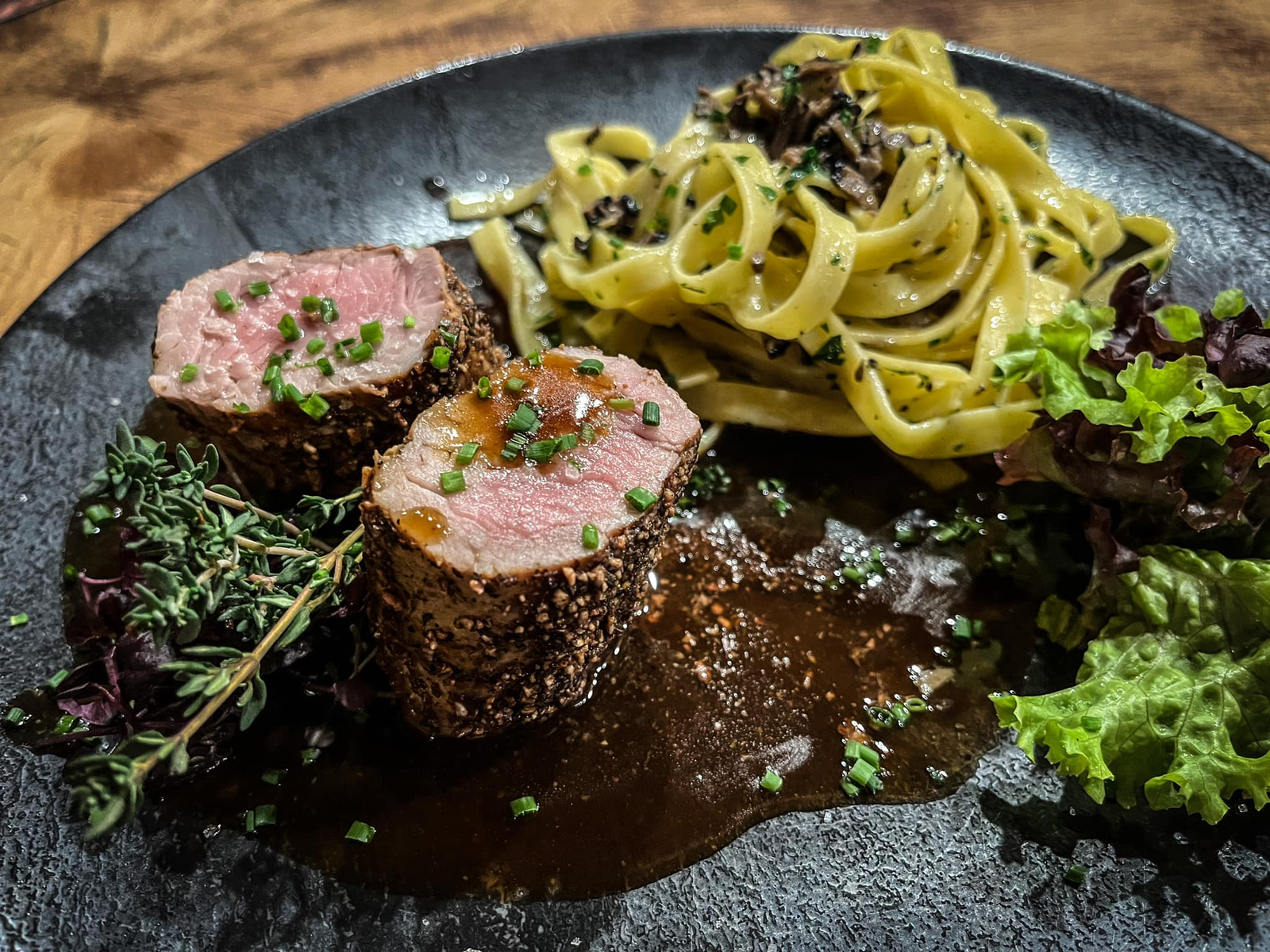 Als Hauptgerichte erwarten Dich zarte Fleisch- und Fischgerichte wie Tagliata di Manzo, Lachsfilet in Pfefferrahmsoße oder ein klassisches Wiener Schnitzel.