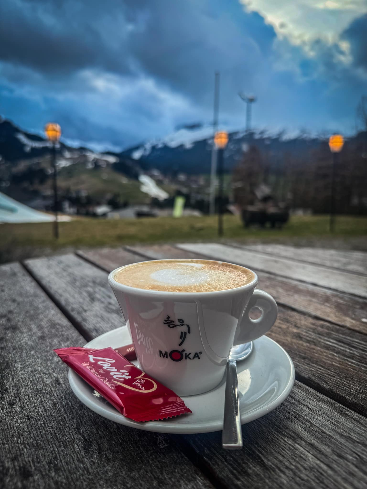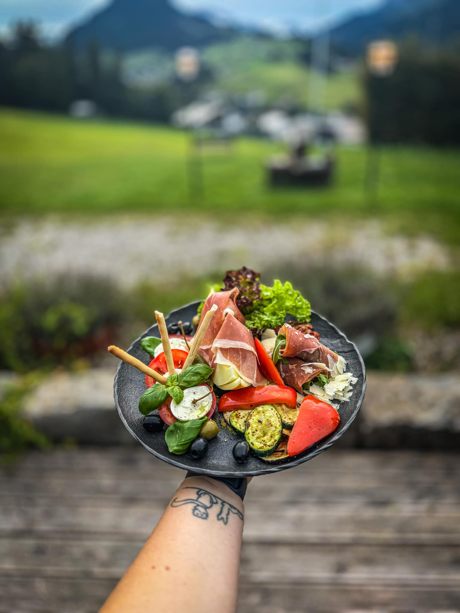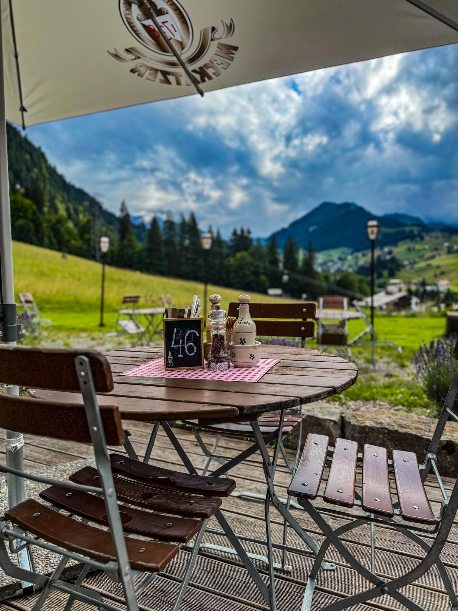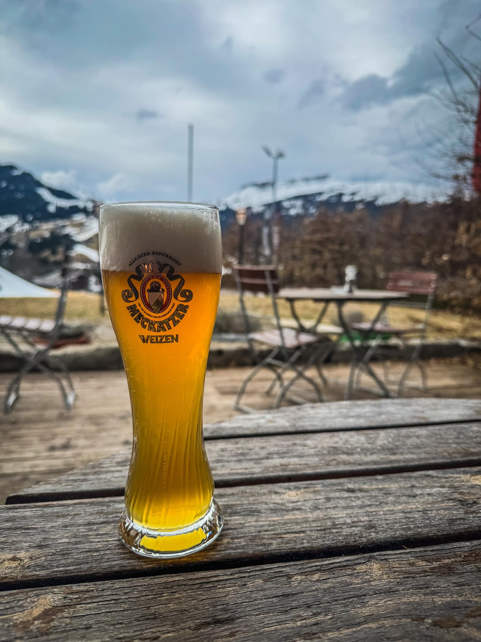 Auf der weitläufigen Sonnenterrasse genießt du nicht nur Allgäuer Spezialitäten, sondern auch den atemberaubenden Panoramablick auf die Walser Bergwelt.